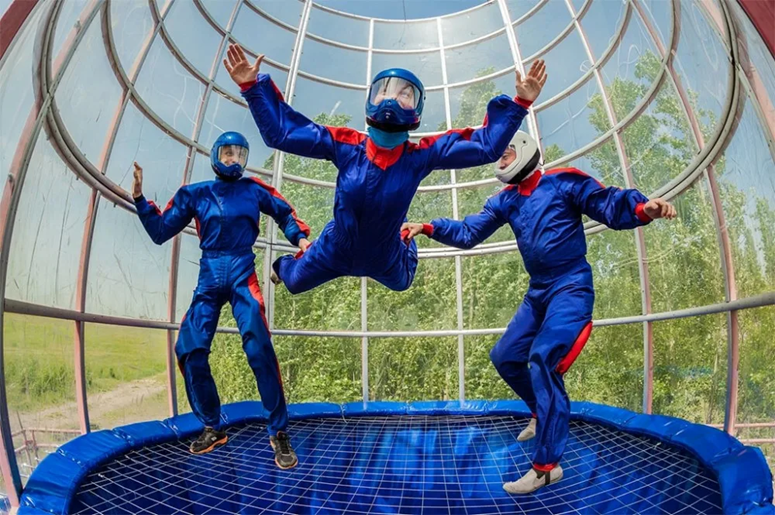 Данный вид развлечение представляет собой замкнутое пространство в виде трубы, направленной вверх. Снизу вместо части пола установлена сетка, через которую подается поток воздуха со скоростью до 300 км/ч. Он поднимает человека, позволяя ему парить, забыв о существовании земного притяжения. Получить такие ощущения можно только прыгнув с парашютом, и летя до раскрытия купола. Процесс сродни парению птиц. Расположены точки развлечений в Санкт-Петербурга на Северной дороге 12 и Приморском проспекте 72.